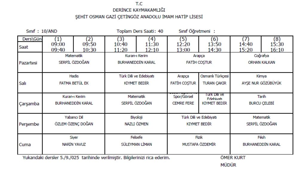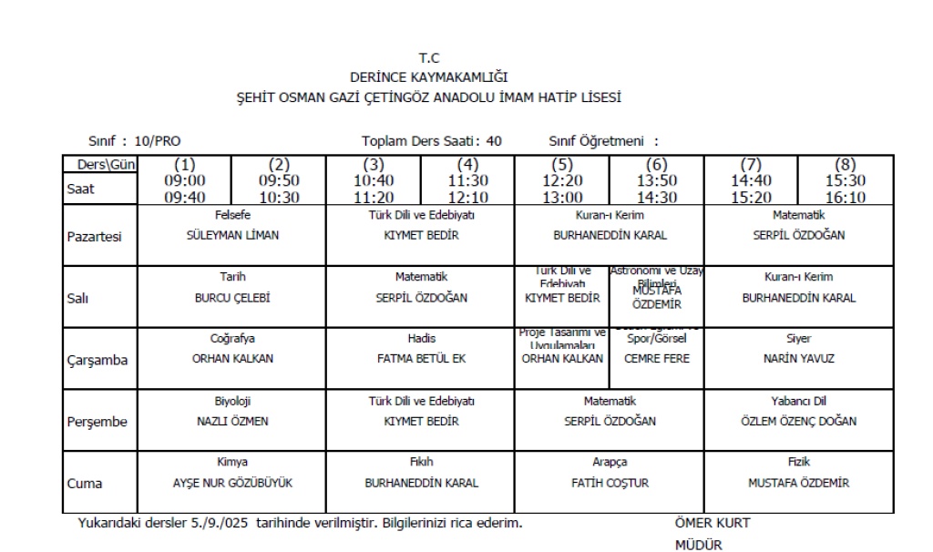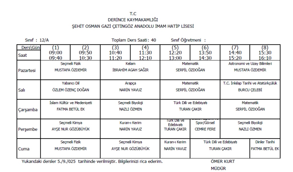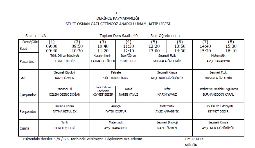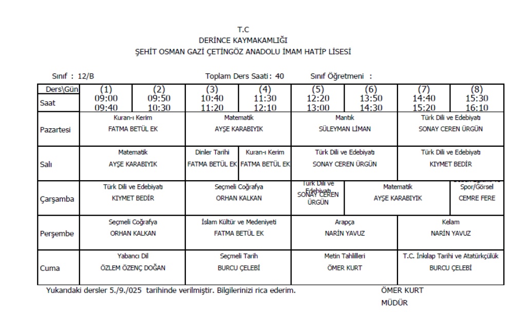 Sınıflarımıza ait ders programları aşağıda verilmiştir.