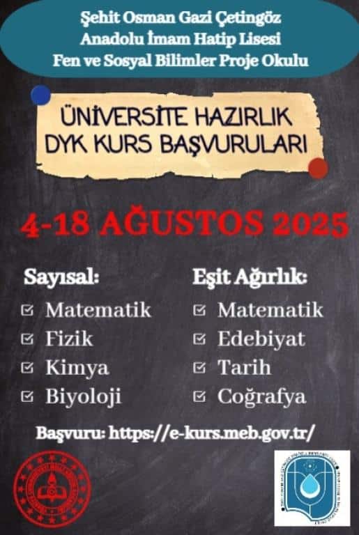 Okulumuzda açılan ücretsiz Destekleme ve Yetiştirme Kurslarından yararlanmak için 4-18 Ağustos 2025 tarihleri arasında e-kurs modülünden başvuru yapılması gerekmektedir.